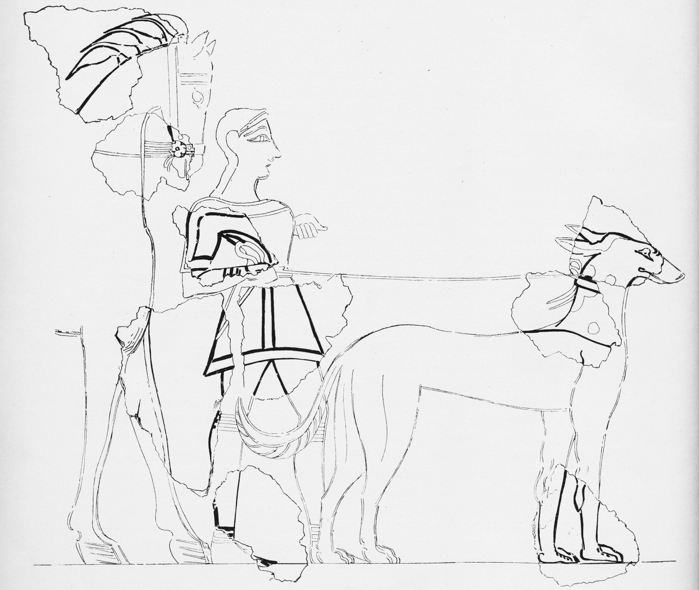 It may, however, be of greater academic interest to inquire after the iconographic sources that inspired de Jong’s caricature. As rendered, the figure appears to be a composite of figures represented in the wall paintings from the Mycenaean palace at Tiryns, excavated by the German Archaeological Institute and published in 1912 in the second volume of the official excavation reports of the site (Tiryns II, by Gerhardt Rodenwaldt). The stance of the man and his sleeved tunic are paralleled in a fragmentary representation of a hunter, reconstructed between a horse and hunting dog in Fig. 47. The hands of de Jong’s figure, outstretched and supporting an upright red heart in front of his body, mirror the position of the hands of a female figure carrying a pyxis in the “Grosse Frauenprozession” (Tiryns II, pl. VIII).