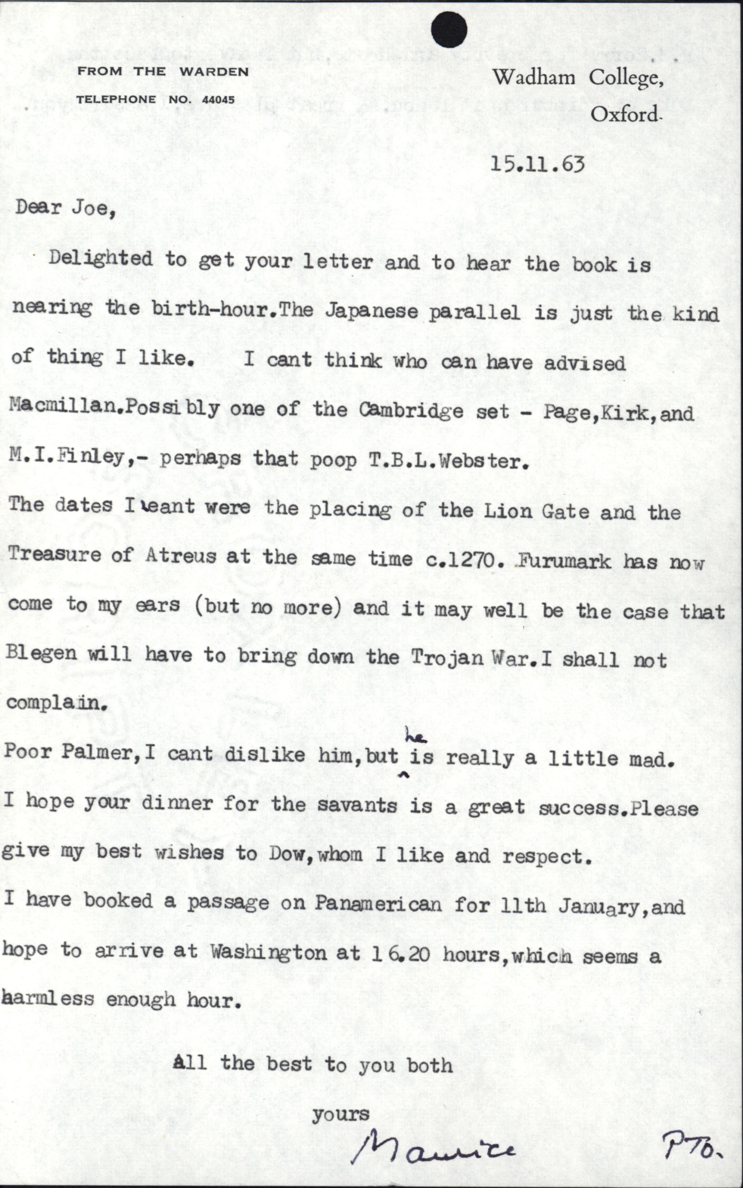 Bowra advising Alsop on issues of Mycenaean chronology (Archives and Rare Book Library, University of Cincinnati)
