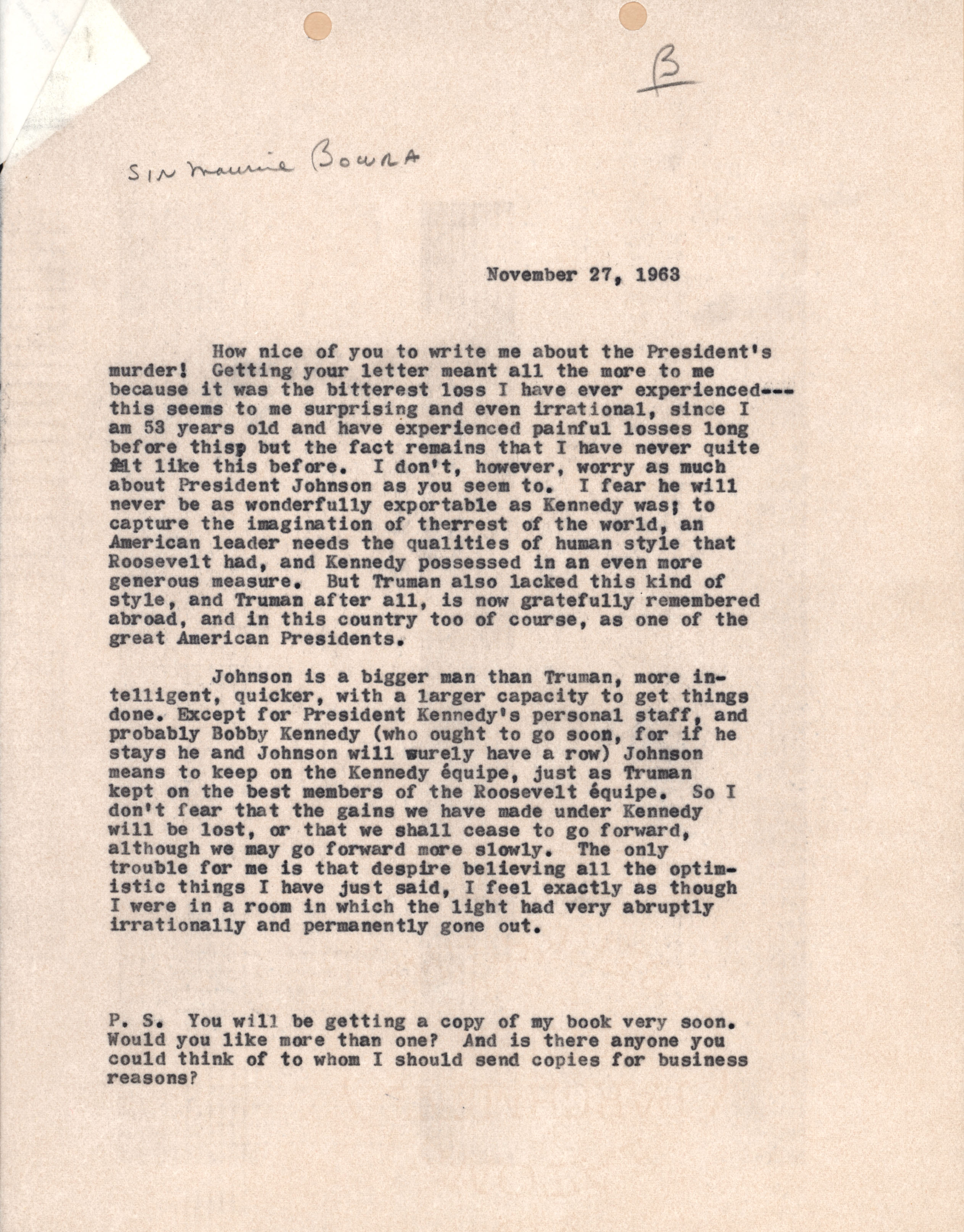 Alsop writing to Bowra about President Kennedy’s assassination (Archives and Rare Book Library, University of Cincinnati)