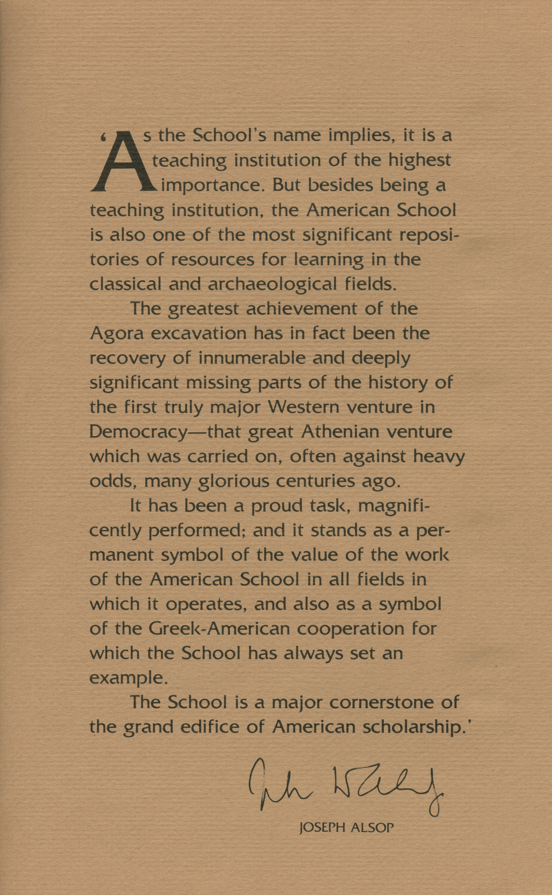 For the preceding reasons it seems hardly a surprise that Alsop’s associations with Greece lasted long after the publication of From the Silent Earth. He continued to correspond with Blegen until 1966, their final exchange being at the time of Elizabeth Blegen’s death in November of that year. After his retirement in 1974 he became even more involved in Greek affairs as a trustee of ASCSA (1965-1985). In that role he worked diligently with Betsy Whitehead, president of the Board of Trustees, to build the School’s endowment in its centennial campaign and he was responsible for arranging a congratulatory telegram from President Reagan. In the early 1980s he conducted a vigorous academic correspondence with fellow trustee Malcolm Wiener, once again on the subject of Mycenaean Knossos among others. Men like Alsop, though little known to scholars who today use ASCSA’s facilities in Athens, have worked since its foundation in 1881 to make the School what is today — a worldclass center of academic excellence that continues to thrive, even in challenging financial environments. They deserve our gratitude and remembrance.