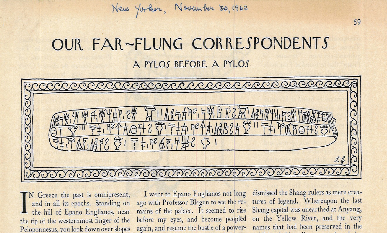 Four of five boxes (#1-3 and 5) either contain drafts of Alsop’s 1962 article about Blegen in The New Yorker or From the Silent Earth. In several instances, the manuscripts are annotated in the hands of the aforementioned scholars, who served as Alsop’s unofficial advisory panel. The most valuable part of the archive consists of letters in Box 4, in which views are expressed about Aegean prehistory that Alsop’s correspondents might have been reluctant to put in print. We find in them an entrée into the world of academic politics at a time when debate over the dating of Linear B tablets found by Sir Arthur Evans at Knossos was raging.