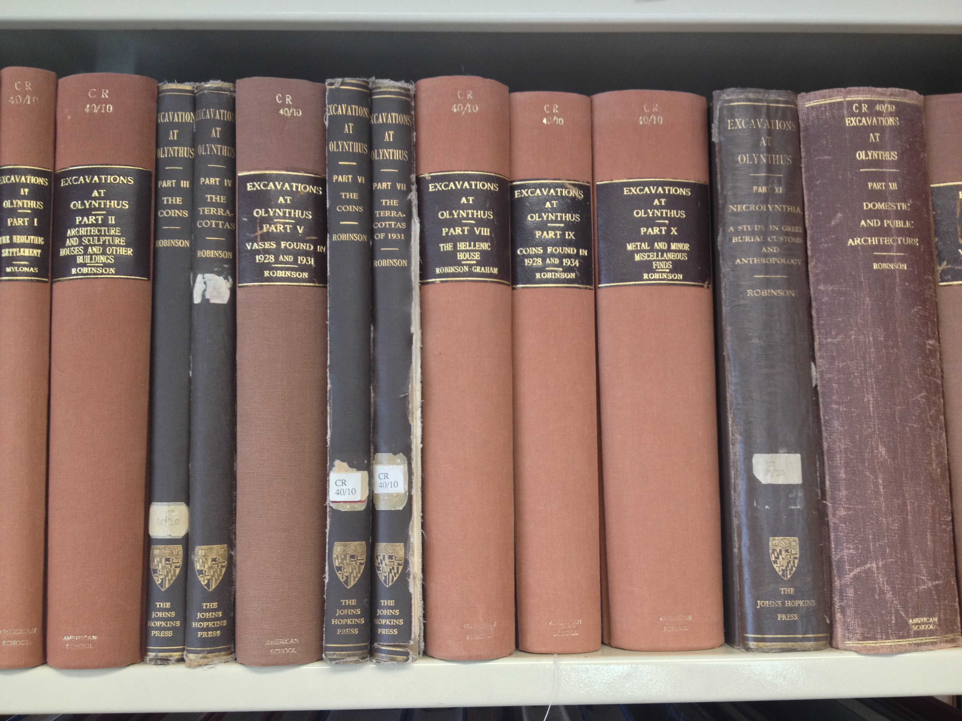The Olynthus volumes on the shelf of the Blegen Library in the ASCSA