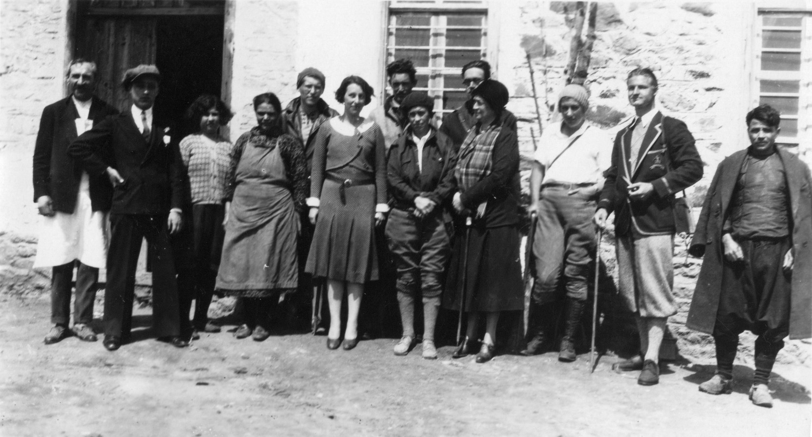 Olynthus Excavations, in front of the dig house, 1931. Mary Ross Ellingson (sixth from left). ASCSA Archives, Saul and Gladys Weinberg Papers.