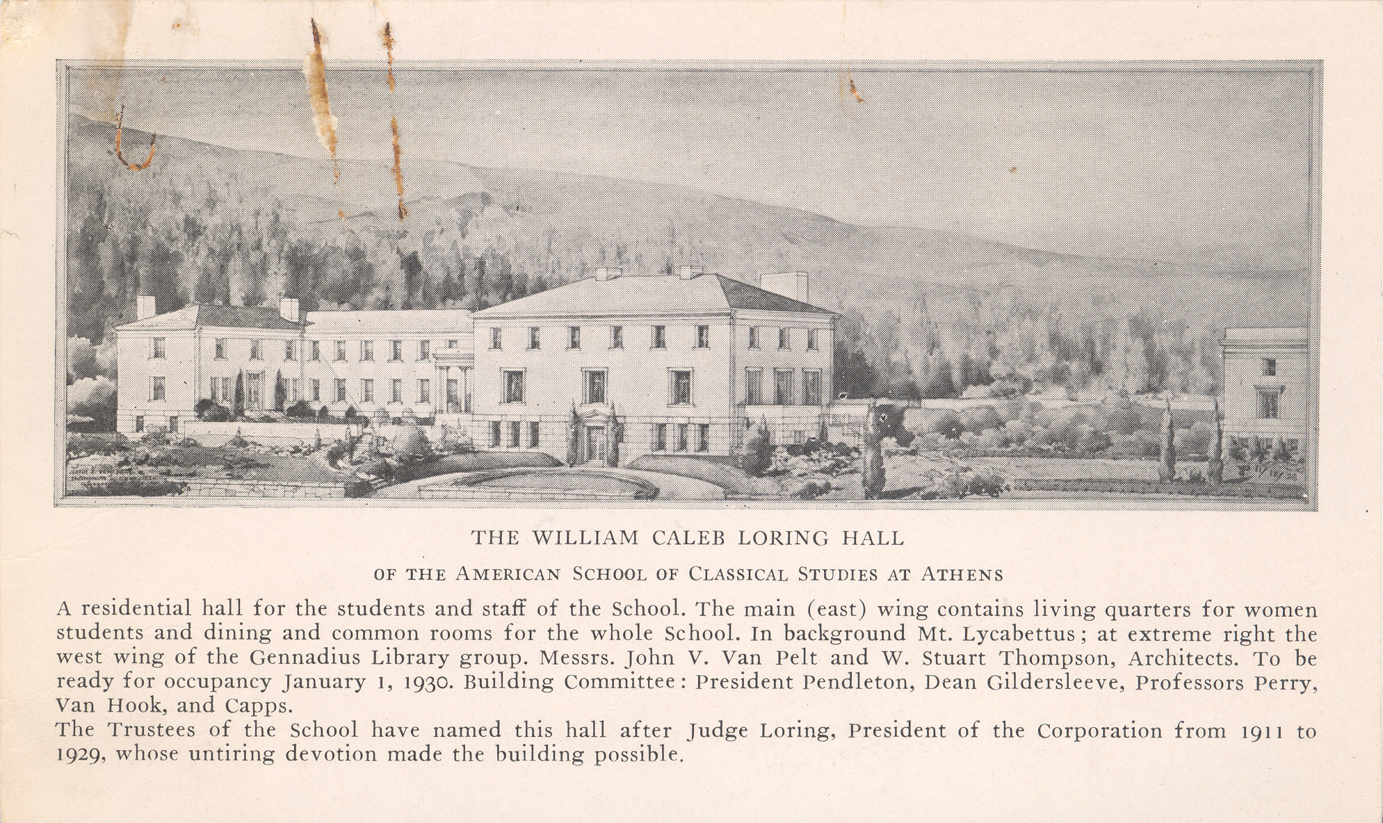 Despite the lack of optimism expressed by the members of the WHC, the School managed to raise quickly the $66,000 needed for the residential hall, buy the BSA lot, and begin construction in the fall of 1928. The hall was named after Judge William Caleb Loring, honoring his patience, firmness, and diplomatic astuteness. W. Stuart Thompson and John Van Pelt were the architects. Not wanting to compete with the grandiose facade of the Gennadius Library, they opted for a plain one, placing the building’s Doric colonnade in such a way that it faced away from the Library.