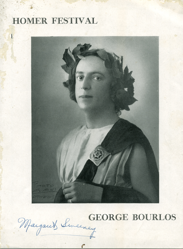 Actor George Bourlos. Cover of a brochure from a previous performance by Bourlos in 1949. ASCSA Archives, Oscar Broneer Papers.