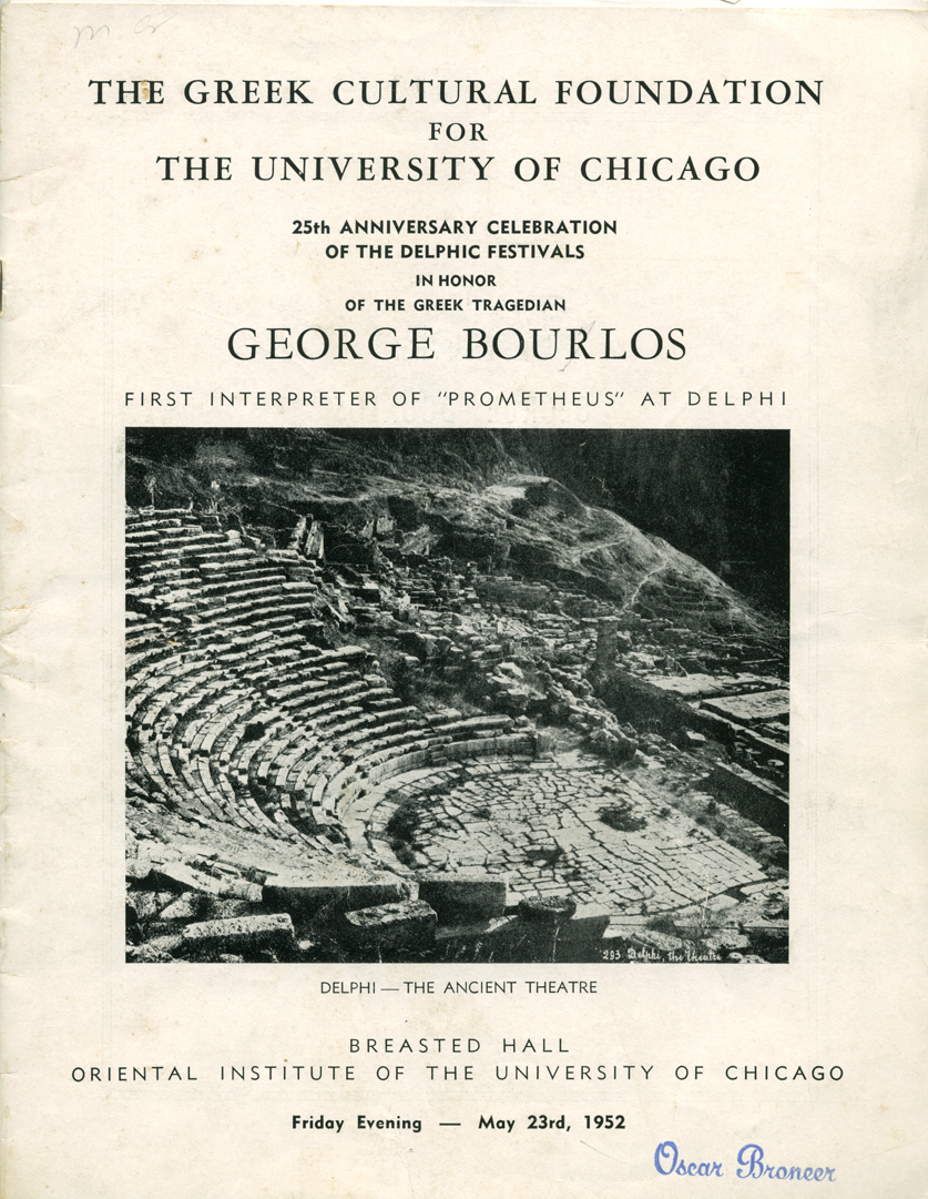 “Now we have a program lined up for May 23 –the twenty-fifth anniversary celebration of the Delphic Festival of 1927-which will take place at the Oriental Institute with George Bourlos giving readings from the Prometheus with a background chorus of maidens. Whether this will do us any good or not I have no notion, but it will be an invited audience and be given under our auspices. I hope that it will be a success.” Smith cautioned that the Foundation lacked organization and true commitment to its aims, despite Broneer’s initial enthusiasm. Even at the start one could discern the first cracks in the relationship between the University and the Greek community.