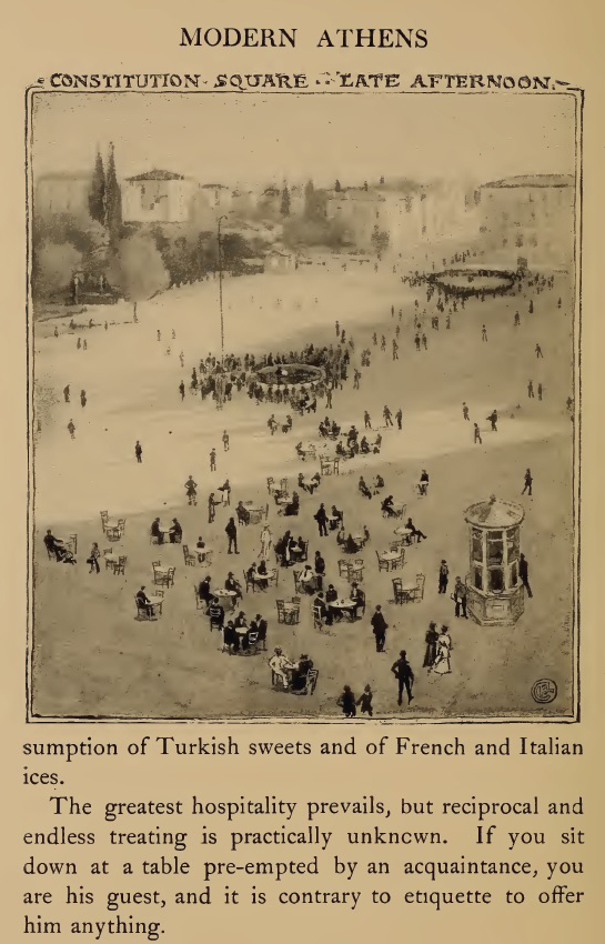 George Horton in Modern Athens recounted a tale of two cities, “each differing from the other in climate, in traditions, and to a great extent, in character of population.” Horton’s winter city, was a European city, “the resort of tourists, diplomats, and climate seekers,” where one ate “course dinners at the Angleterre Hotel,” attended service at the English church, danced “the barn dance at Madame Schliemann’s,” and played “charades in the library of the American School” (p. 1). This state of affairs lasted from October until May. “Then all changed. The diplomats and the climate-seekers hide them away, and the tourists cease to come” (p. 2). The summer city swarmed with Greeks from Egypt, Turkey, and Roumania, who drank resin wine and masticha, ate “pilaf, stuffed courgas, and fish with garlic-sauce, by candle light in the squares,” and attended open-air theaters.