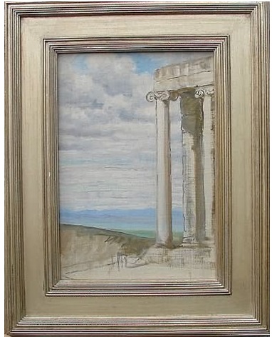 I succeeded in locating five more Grecian landscapes by Brewster: the Temple of Poseidon at Sounion, the Temple of Olympian Zeus in Athens, the Temple of Aphaia on the island of Aigina (?), the Nike Temple on the Acropolis, as well as a view of the Corinthian Gulf. Notice how in her paintings of Greek temples, Brewster opted for a partial and angle view, just as if she were catching them with the corner of her eye. (One of her paintings, the Olympieion I believe, was sold for $12,000 a few years ago. The Jaffa Gate was sold for $10,000 at Christies, April 12, 2007.)