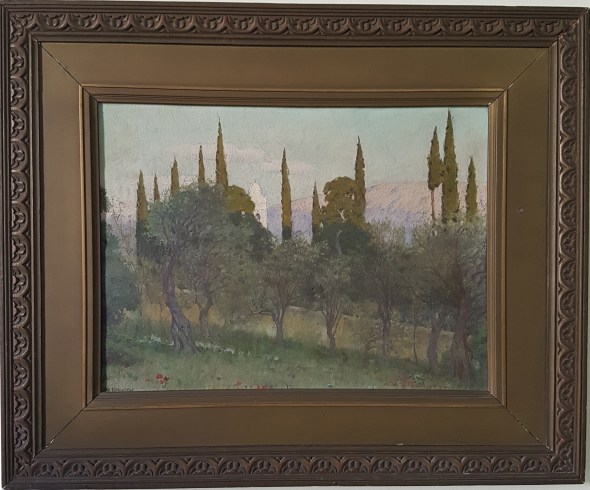 Brewster’s painting, which adorns the small sitting room in the Director’s house, is, like most of her other paintings, of small dimensions (12×16 inches). On the back of the old frame, the theme is identified by Anna herself as: “Mt. Hymettus from the American School.” Looking at the painting, one sees in the foreground the School’s lower garden, once full of olive trees, with its characteristic stone wall. Next come the tall cypresses of Moni Petraki (the near-by monastery) and part of the church’s bell tower (which no longer exists). The entire scene is set against a barren Hymettus. Her greens are soft but vibrant. The painting is signed on the lower left side.