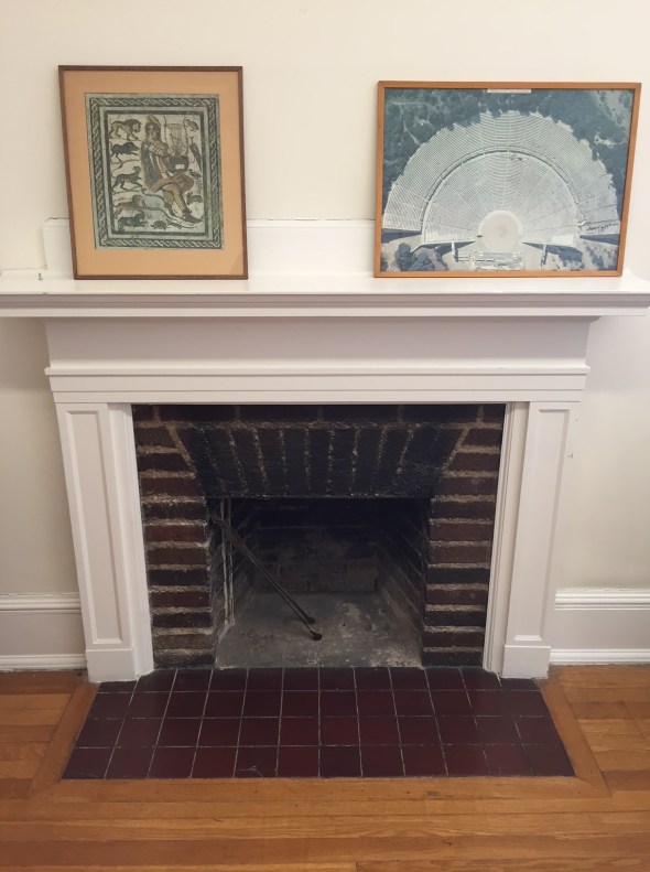 One of Fr. Schoder’s aerial photos (the theater of Epidauros) on the fireplace mantel of an administrative office at the ASCSA.