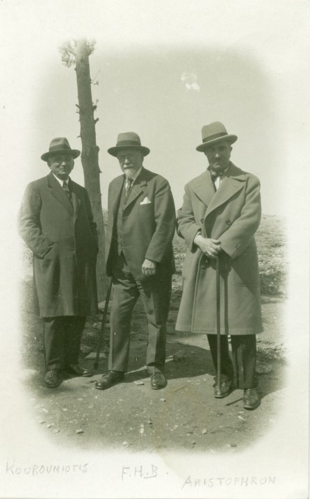 Francis Bacon between Greek archaeologists Konstantinos Kourouniotis and Panayotis Aristophron, 1931. ASCSA Archives, Francis H. Bacon Papers.