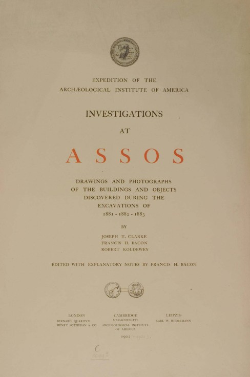 T. Clarke, F. H. Bacon, and R. Koldewey, Investigations at Assos: Drawings and Photographs of the Buildings and Objects Discovered During the Excavations of 1881-1882-1883, Cambridge Mass. 1902-1921.