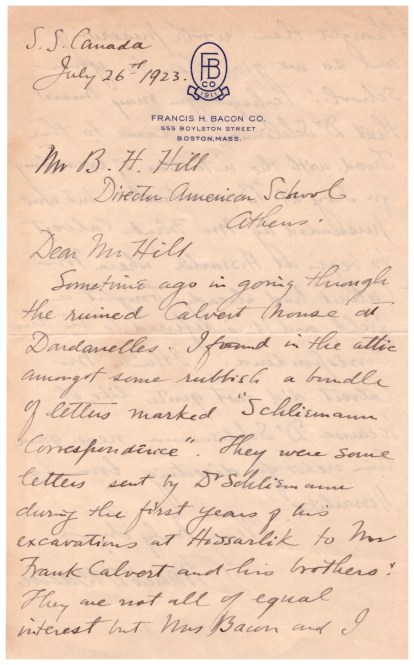 In 1923, while on board a ship bound for New York, Bacon wrote a letter to the Director of the American School, Bert Hodge Hill, asking him to accept eighty-nine letters that Schliemann had written to Frank Calvert, the U. S. consular agent in the Dardanelles, in the early 1870s, as well as penciled drafts of a few letters that Calvert wrote to Schliemann. Bacon had found them while cleaning the destroyed Calvert mansion at the Dardanelles. With both men dead (Schliemann in 1890 and Calvert in 1907), Bacon wished, through the letters, to preserve for posterity the complicated relationship and secret rivalry between Schliemann and Calvert. As a member of the Calvert family, he would have heard stories about the injustice that Schliemann had done to Calvert by not crediting him with the discovery of the site of ancient Troy.