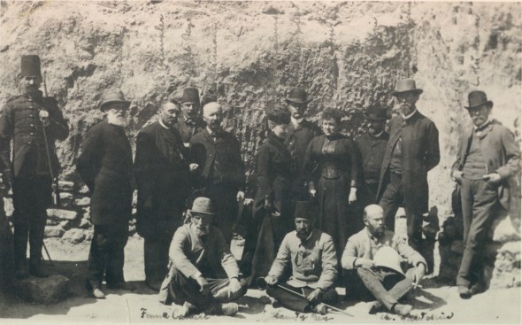 Gathering of archaeologists at Troy, 1890 (a few months before Schliemann’s death). First row (l-r) seated: Frank Calvert, Osman Hamdi Bey, and Charles Waldstein. Second row standing: Rudolph Virchow, Wilhelm Grempler, Ghalib Bey, Heinrich Schliemann, Edith Calvert, Wilhelm Dörpfeld, Madam Babin, Charles Louis Henri Babin, Friedrich Carl von Duhn and Carl Humann (I would like to thank Filiz Songu for identifying the people of the second row). ASCSA Archives, Heinrich Schliemann Papers.