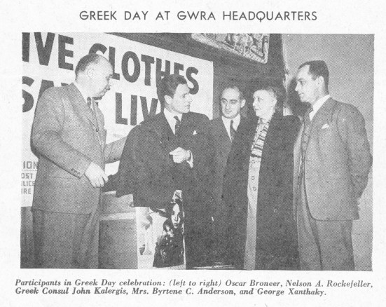 By December of 1942, Broneer was offering his services to the newly established organization of Foreign Relief and Rehabilitation Operations (OFFRO) run by the U.S. State Department, which hired him in May of 1943. Towards the end of the year, he received an invitation to attend a benefit dinner organized by the GWRA in New York on December 17th, 1943. This event proved to be very important for Broneer because it was here that he met Skouras, the owner of Fox Studios and the national president of the GWRA. Skouras immediately offered him work at the GWRA. Broneer was an attractive candidate, a Swedish-born American, fluent in Swedish and Greek, with impressive knowledge and firsthand experience of Greece. Skouras admired Broneer, who was already been actively involved in shipping food and supplies to Greece aboard Swedish ships (Sweden had remained neutral during World War II). By February of 1944, Broneer had accepted Skouras’s offer to work for the GWRA as executive vice president, a position that he held until 1946.