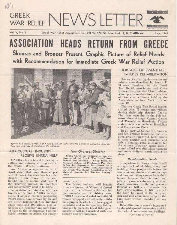 Greek War Relief’s Newsletter announcing the return of Spyros Skouras and Oscar Broneer from Greece, June 1945. ASCSA Archives, Oscar Broneer Papers.