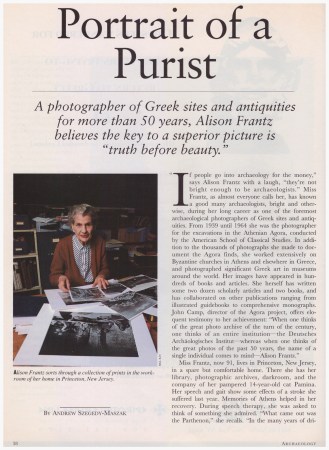 “The M. Alison Frantz Fellowship, formerly known as the Gennadeion Fellowship in Post-Classical Studies, was named in honor of archaeologist, Byzantinist, and photographer M. Alison Frantz (1903-1995), a scholar of the post-classical Athenian Agora whose photographs of antiquities are widely used in books on Greek culture. Frantz donated a large part of her photographic collection to the American School, where is available for research.”