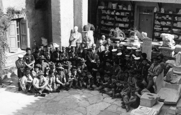 Landscaping of the Agora. Boy scouts of Athens and Attica in the yard of the Old Excavation House at 25 Asteroskopeiou Street. Among them H. A. Thompson, J. L. Caskey, and Ralph E. Griswold. The scouts participated in the tree planting program at the Agora, 1955. Source: ASCSA, Athenian Agora Excavations ( 2003.01.0372)