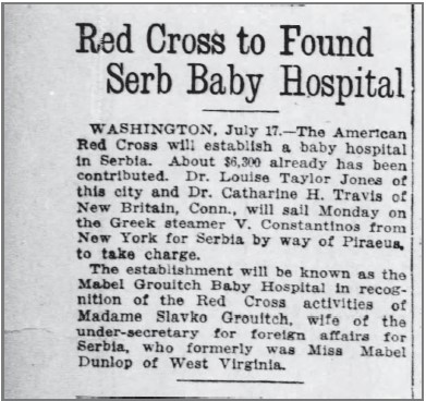 Within a short time, Mabel through her various European connections secured the aid of the International Red Cross, while through targeted publicity in the U.S. press, she managed to attract the attention of Mabel Boardman, the head of the American Red Cross, hoping to place Serbia on the list of the ARC beneficiaries (St. Louis Globe-Democrat, Sept. 27, 1914). In February 1915, Mabel was in New York fundraising for Serbia. Within a few days after her arrival she put together the Serbian Agricultural Relief Commission, which included Charles W. Eliot, president emeritus of Harvard, Charles Scribner, and journalist Albert Shaw. The Commission’s goal was to secure seed, grains and farm implements for 800,000 starving Serbians: “All of the able-bodied men of Serbia are at the front. The women and children must plant and cultivate the crops in the spring or there will be no grain on which the nation can live next winter” (The Wilkes-Barre Record, February 5, 1915).  In addition, the ARC had raised enough money to establish a baby hospital in Serbia. The announcement in the newspapers also mentioned that the establishment would be known as the Mabel Grouitch Baby Hospital in recognition of her Red Cross activities (Pittsburgh Daily Post, 18 July 1915).