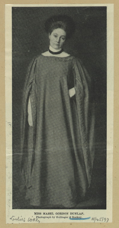 “The rooms were decorated for the occasion with cut flowers, and softly lighted with shaded lamps, and the lecturer was clad in a wonderful purple robe, embroidered with gold in a Greek meander pattern. The gown is that of a Master of Fine Arts in the University of Pisa a hundred years ago, and with the accompanying gold-tasseled cap, constitutes Miss Dunlap’s lecture costume. In the daytime it is purple and at night white, but otherwise never changes.”