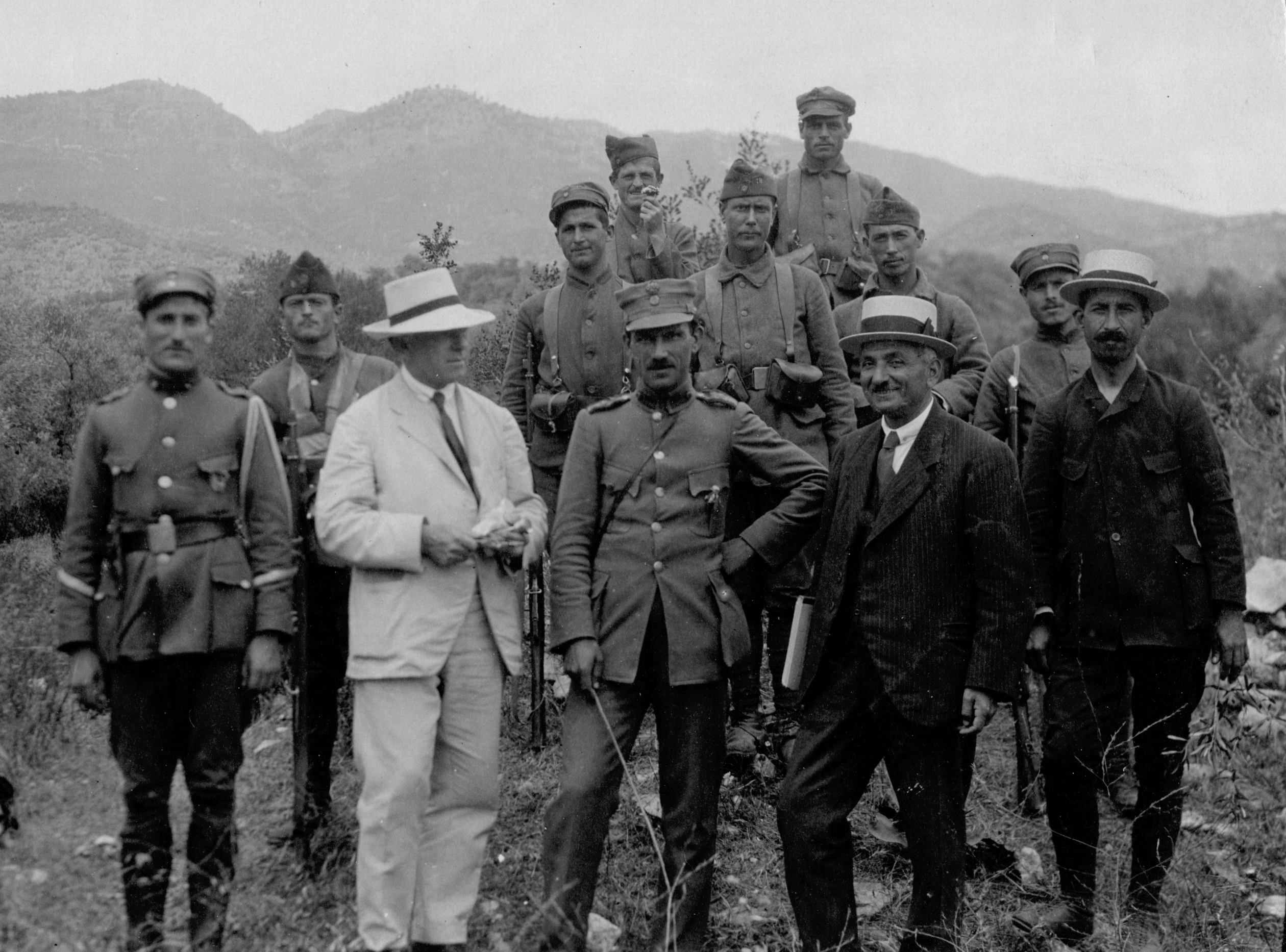Bert Hodge Hill (in white suit), Greek officer, Konstantinos Kourouniotis (in dark suit), Asia Minor, ca. 1921. ASCSA Archives, Carl W. Blegen Papers.