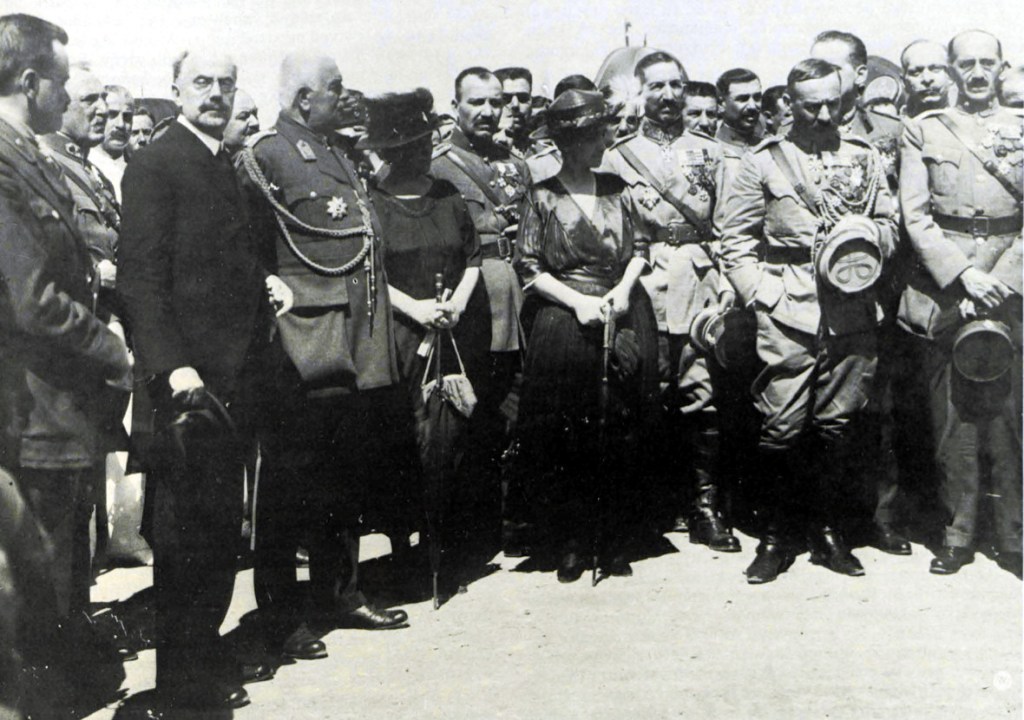 Aristides Stergiadis on the left (in the civilian suit) with Field Marshall Leonidas Paraskevopoulos and Colonel Theodore Pangalos at Smyrna, October 1920. Source: Wikimedia, public domain.