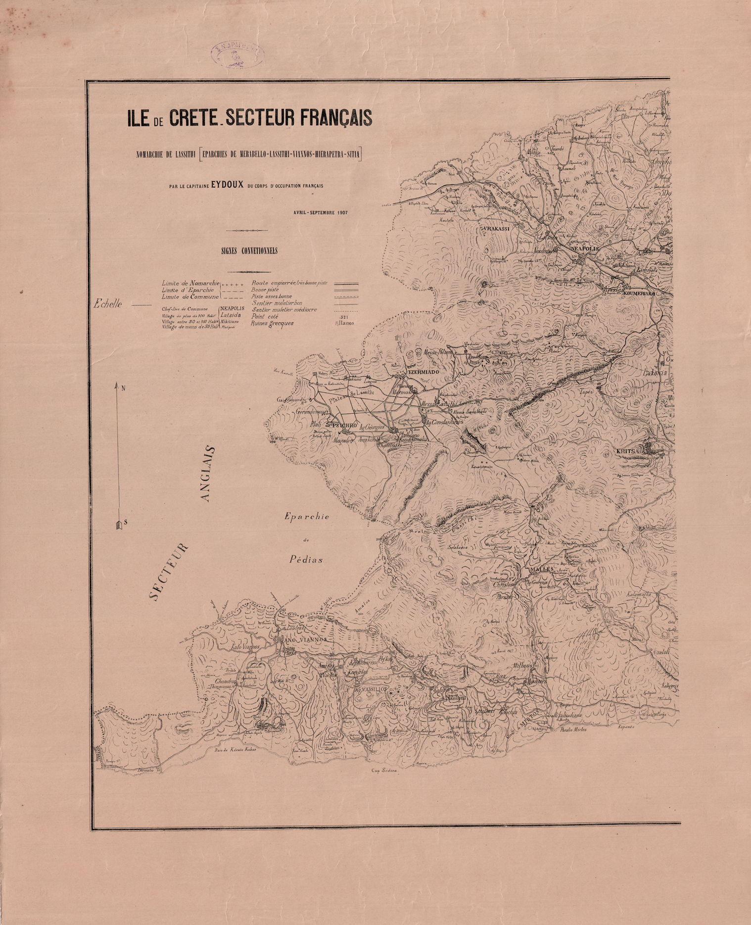 The publication of his diaries does not include any maps, which would have been very useful to the reader. Upon my return to Athens, however, I was fortunate to find in the Stephanos Dragoumis papers (Dragoumis served as General Commissioner of Crete and Macedonia in 1912-1913) at the Archives of the American School of Classical Studies three leaves of a French map of the Lasithi region from 1907, documenting the road system. This allowed me to follow and understand Destelle’s travels. (These maps are now digitized and available online in high resolution.)
