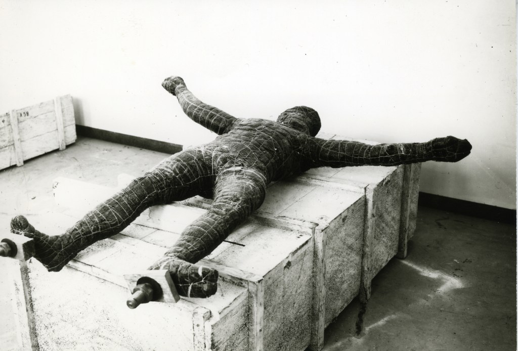Fig. 7: Security measures in the National Archaeological Museum of Athens after October 30, 1940, the bronze statue from Artemision wrapped in tar paper. Source: National Archaeological Museum, photo archive.