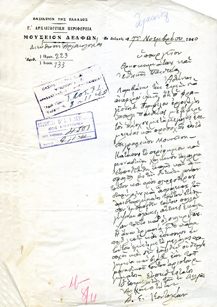 A document in the historical archives of the Greek Archaeological Service provides information about the protective measures taken for the Delphi Charioteer. Written on November 7, 1940, by the museum employee (and self-appointed curator) Alexandros E. Kontoleon (1859-1943), it is addressed to the Greek Ministry of Culture (then “Ministry of Religion and Public Education”) at Athens (fig. 8).