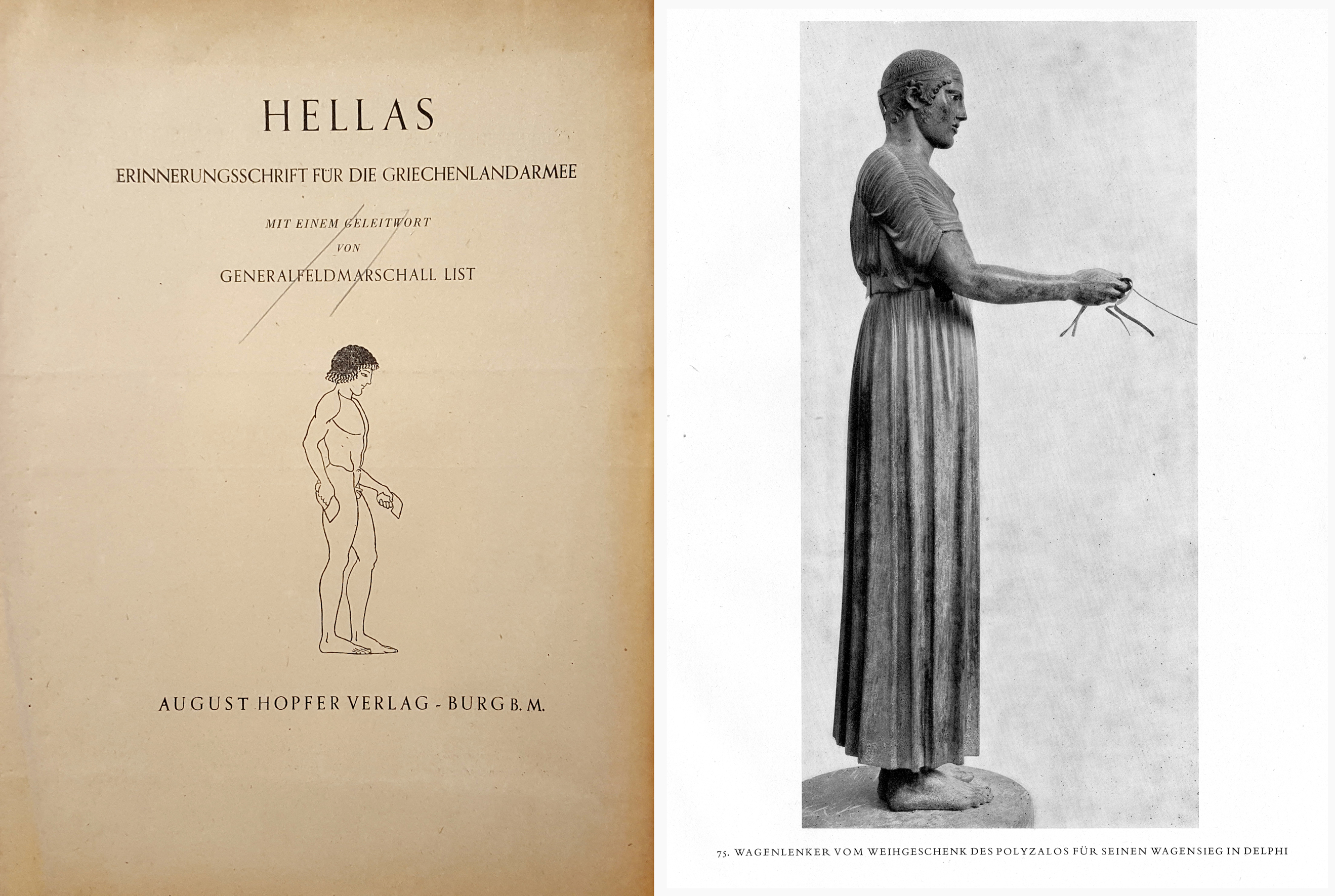 Although never on display during WW II, the Delphi Charioteer was featured in the leaflets of the Kunstschutz, as well as in an elaborate commemorative book by Schoenebeck and Kraiker, titled Hellas (1943) [Figs. 9-10].