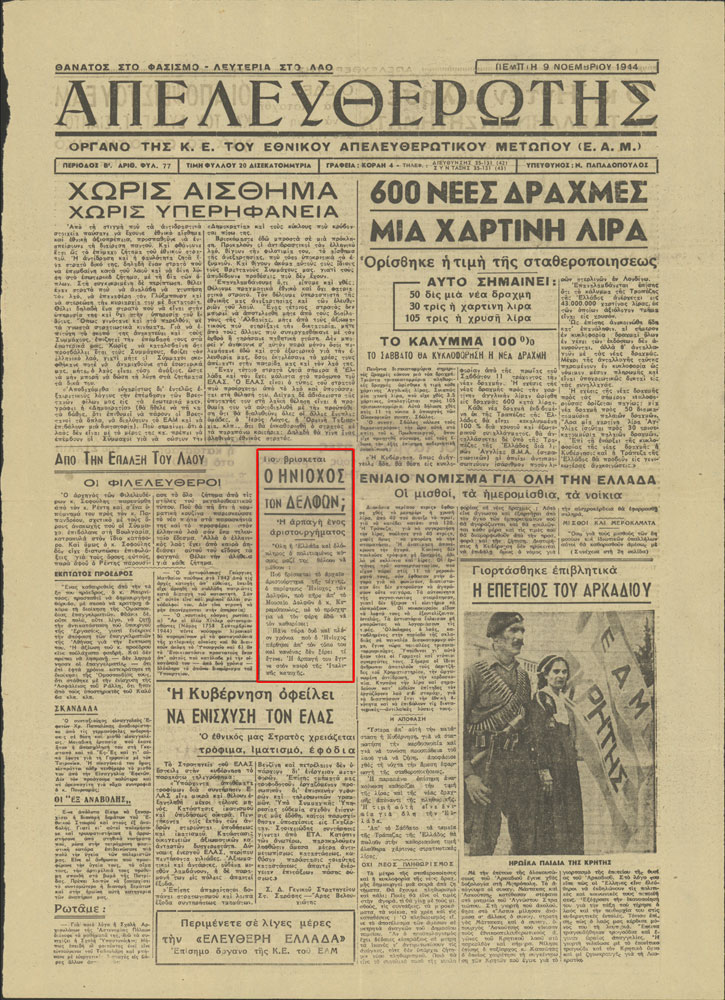 Fig. 10: Title page of newspaper ΑΠΕΛΕΥΘΕΡΩΤΗΣ, 09.11.1944.