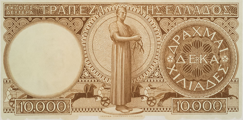 Fig. 11: 10,000 drachma notes with the Delphi Charioteer printed, 1947. Source: Bank of Greece, Center for Culture, Research & Documentation.