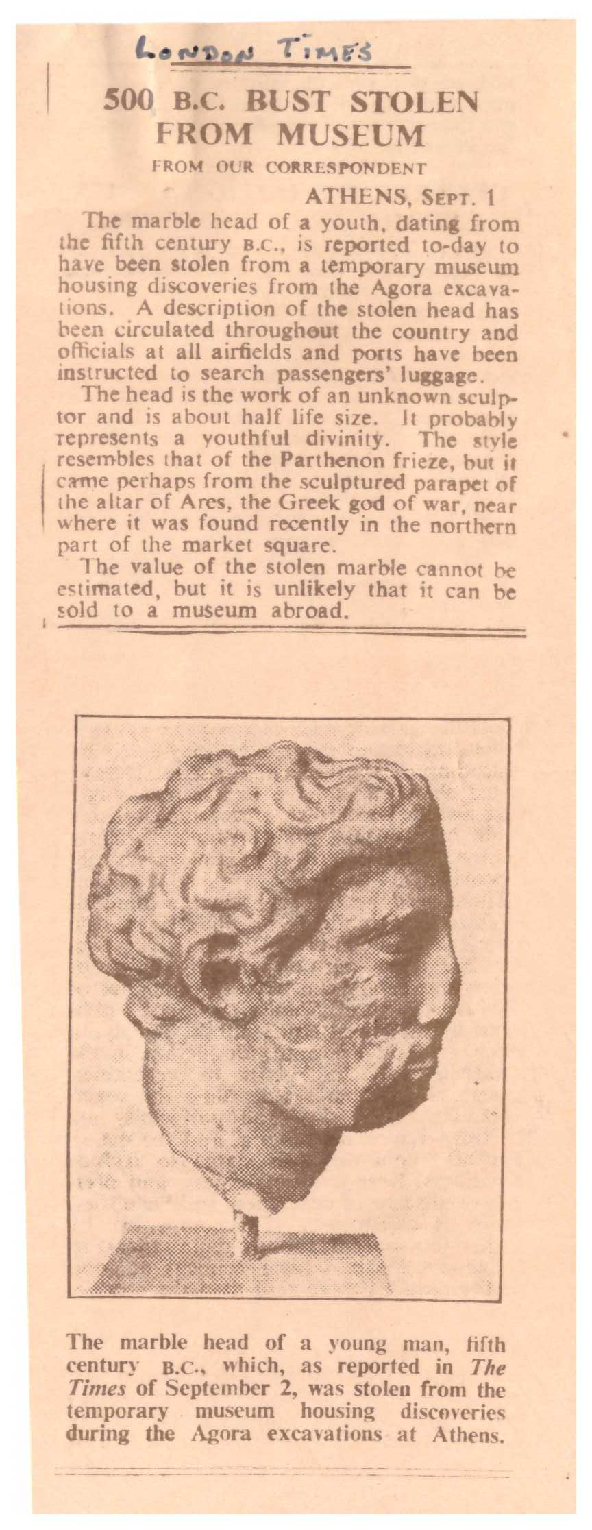 Just as he was about to mail his letter, Vanderpool rushed to add a last-minute postscript: “It looks as though the cat were out of the bag. Today’s NEA reports the theft, having gotten it from police bulletin. Modiano [the Greek correspondent in London] called up at 12.10 for more details… and it will be in London Times.” On September 2, the London Times published a note together with a photo of the stolen head: “500 B.C. Bust Stolen from Museum.” By then the Director of the School must have also found out about the theft although there is no mention of Caskey in the dispatches that Vanderpool sent to Thompson or in all their dealings with the Archaeological service.