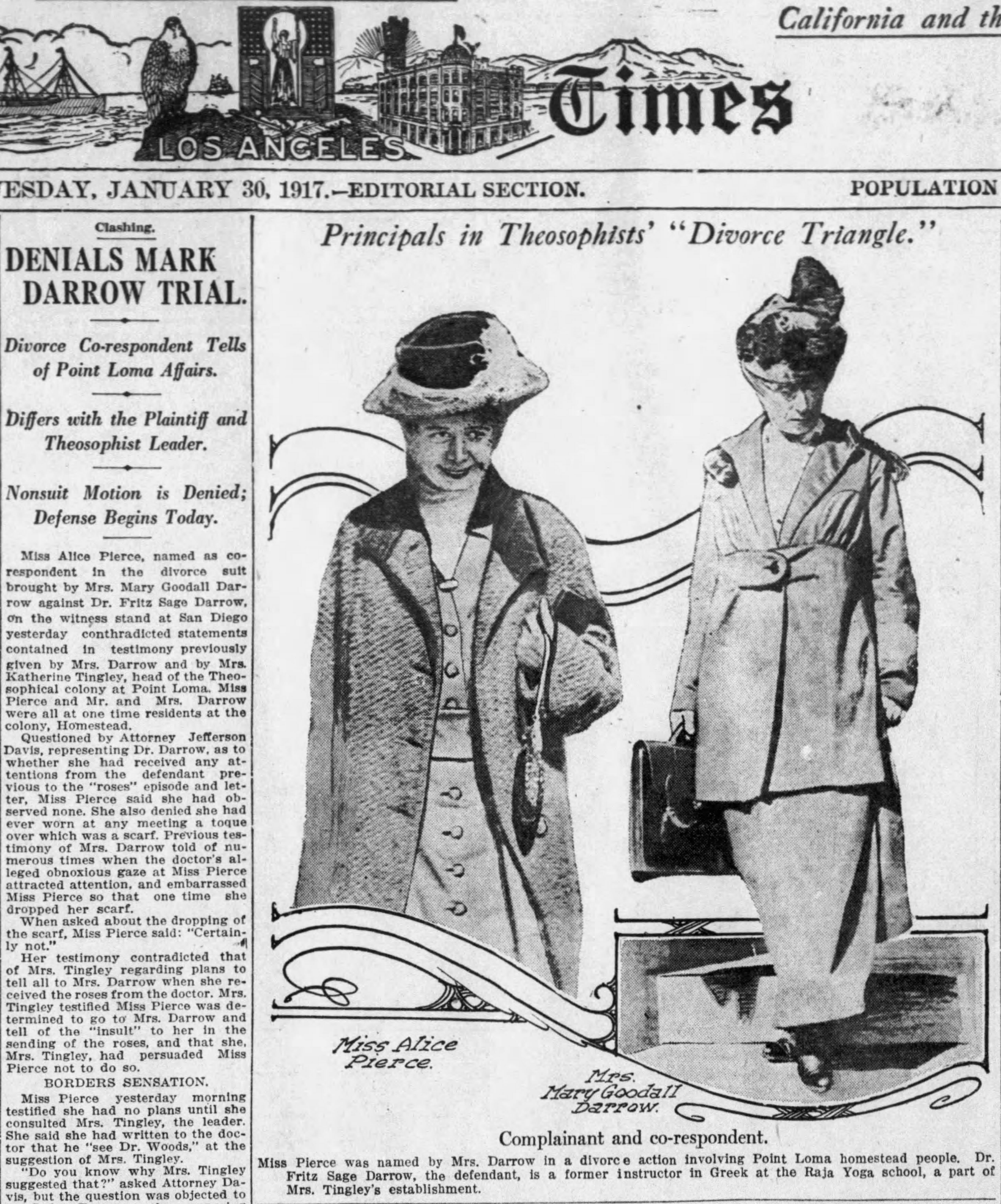 Meanwhile, Fritz and May had already moved to California where they joined a colony of theosophists run by Katherine Tingley at Point Loma (Lomaland). In early 1917, the local newspapers in California were occupied with the sensational Darrow divorce, running headings such as “Denials Mark Darrow Trial,” “The Correspondent Tells of Point Loma Affairs” and featuring photos of May Darrow and her “rival” Alice Pierce in a love triangle. Fritz was forced to depart from the community and also lose custody of his children after his divorce in 1918 ( Kirkley 1997; Ashcraft 2002).