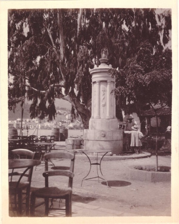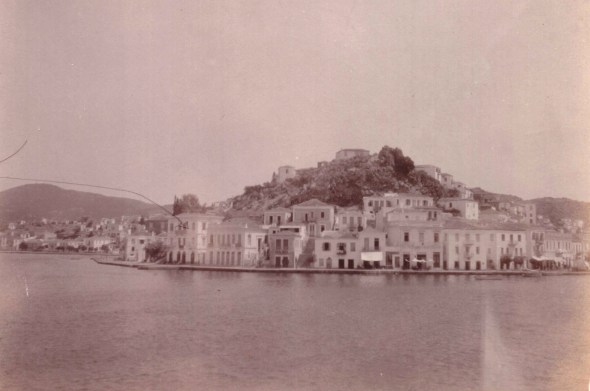 “Picturesque village on the narrow strait, clear blue water, nice room with balcony on the sea. 3 francs. Good eating in restaurant. Coffee and narghileh after under the Eucalyptus tree in the square with the fountain.” (See slideshow below.) After a good night’s sleep, Bacon planned for a day trip to the Temple of Poseidon at Calauria “where Demosthenes is said to have put an end to his life in B.C. 322,” and later in the day he took a sail in the bay, “past a pretty villa on a terrace with some pine trees at the back. The boatman says it belongs to Madame Dragoumis, the author of ‘Stories of a Greek Island.’ As I’d come on account of reading her book, think I’ll call and pay my respects.  Send up my card and a young man comes out, Mad[ame] D[ragoumis]’s son. He is sorry his mother has gone for a walk.” But later that same the evening after Bacon had enjoyed his narghileh on the quai, a boatman brought him an invitation from Madame Dragoumis, “if not too late.” Bacon took a boat across the bay to Villa Gallini, as the house was known, to spend a pleasant evening with the Dragoumis couple, their sons and other friends of the family.