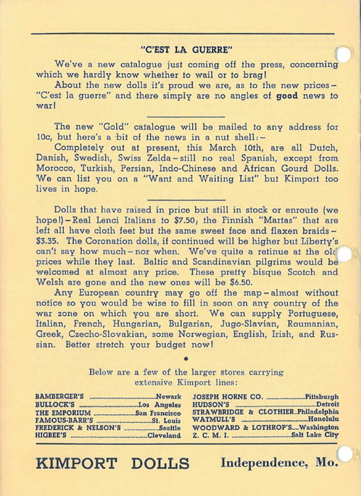The consummate salespeople at Kimport, Inc. responded to the outbreak of war in Europe with a notice captioned “C’est la guerre”: