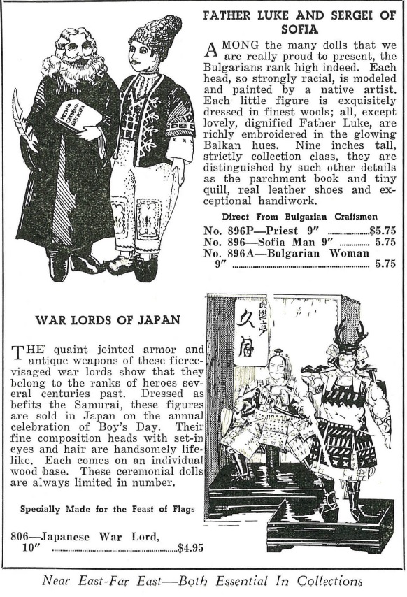 Several Bulgarian dolls were promoted in the same issue: Bulgarian Priest; Bulgarian Waterwitch; Bulgarian Boza-Seller; Bulgarian Bearfighter; Bulgarian Bagpiper; Boris, Bulgarian Peasant; Penka, Bulgarian Peasant; Gitta, Bulgarian Gypsy; King Assen of Bulgaria; a Bulgarian Mummer [“kukeri,” costumed men who perform rituals to scare away evil spirits].
