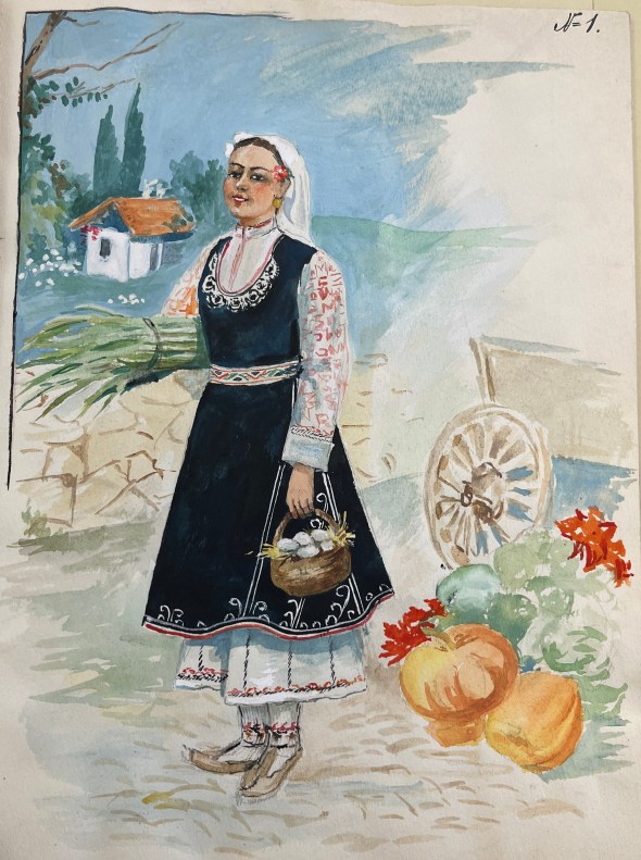 “Some of the dolls, which we sent to New York, had to represent the father of Bulgarian history—the famous monk Payssy from Hilendar. He holds in his hands a manuscript and a pen. To find a feather of the right size and not one, but for every Payssy doll, was quite a problem. Finally it was solved by a duck, belonging to our porter, which awaiting its fate to be eaten at Christmas, provided us meanwhile with the necessary writing accessories.” (Sent to Laird Archer, the resident overseas director of the Near East Foundation in Athens, November 15, 1937).