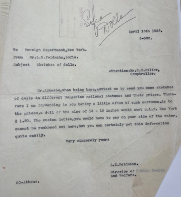 “Mr. Allen was good enough to send the copy of his letter to you under date of January 25th. During the time that he was here, he became aware of the very definite effort I am making to supply the increased demand of dolls for collection. Mr. [Edward C.] Miller has suggested in view of the comments in that letter that I write to you and see what could be done in Bulgaria to create an 8” doll showing definite types of costume which must be authentic and of which we must have the historical background. We need to know the price and the probable cost of delivery to America. After this, there will be the duty. It seems to me that since the commercial people are bringing in an excellent type from Russia, Czechoslovakia, Germany, and also some from China and Japan, that we ought to be able to produce acceptable ones from our territory. Aside from the possibility of the industry providing work for your people, they add greatly to the international interest and may be used effectively in our promotional work.” (Near East Foundation Records, Ewald to Feldmahn, February 16, 1937, “Bulgaria Dolls 1935-1941, Folder 1,” FA406, Box 33).