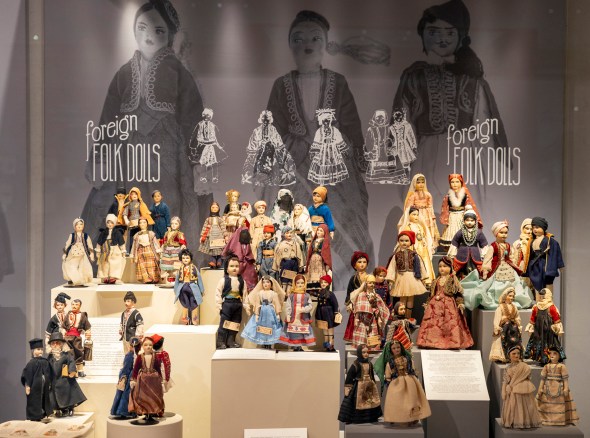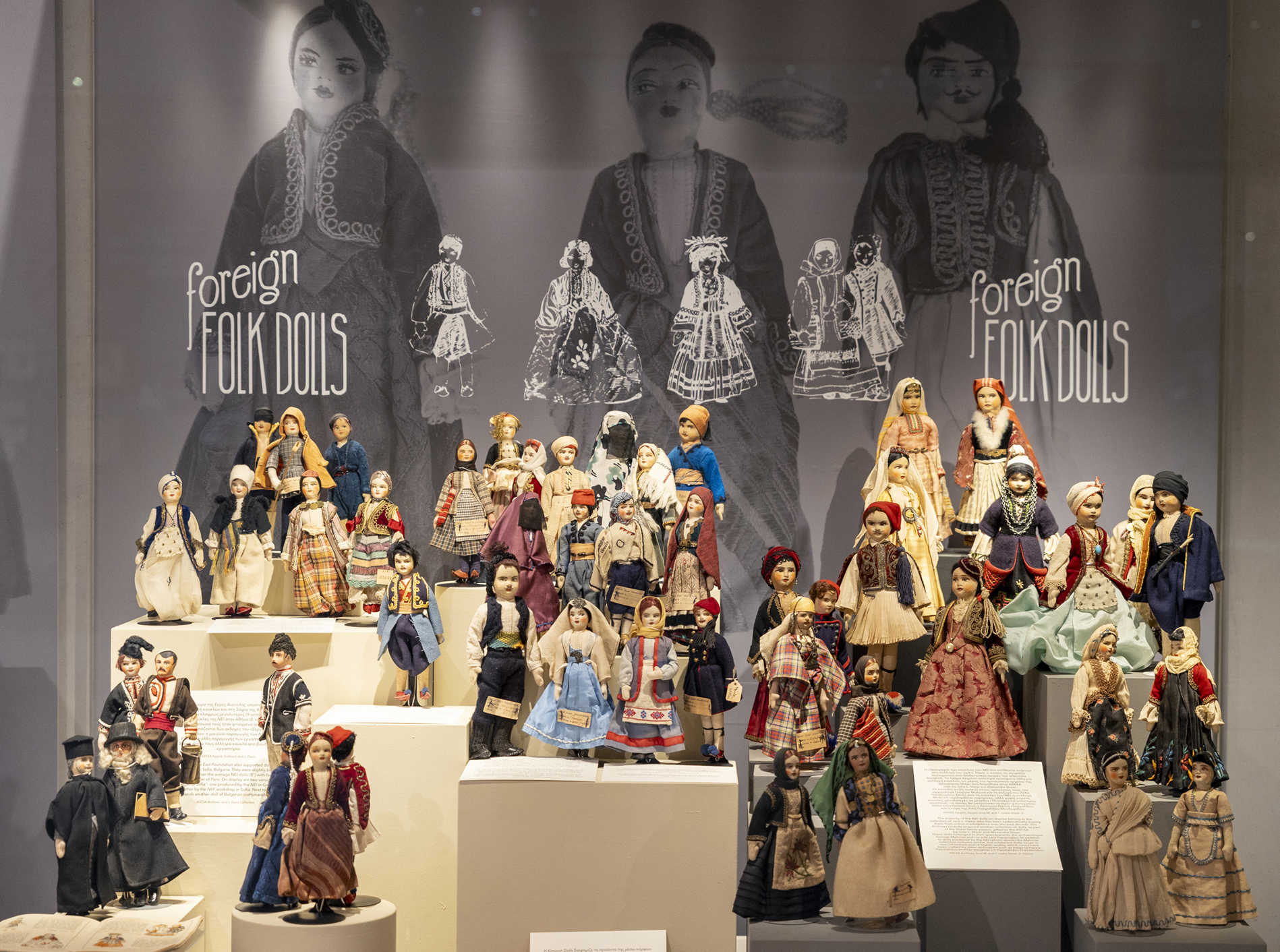 The display of the NEI dolls in In the Name Humanity exhibition. The Bulgarian dolls are shown in the lower left corner.