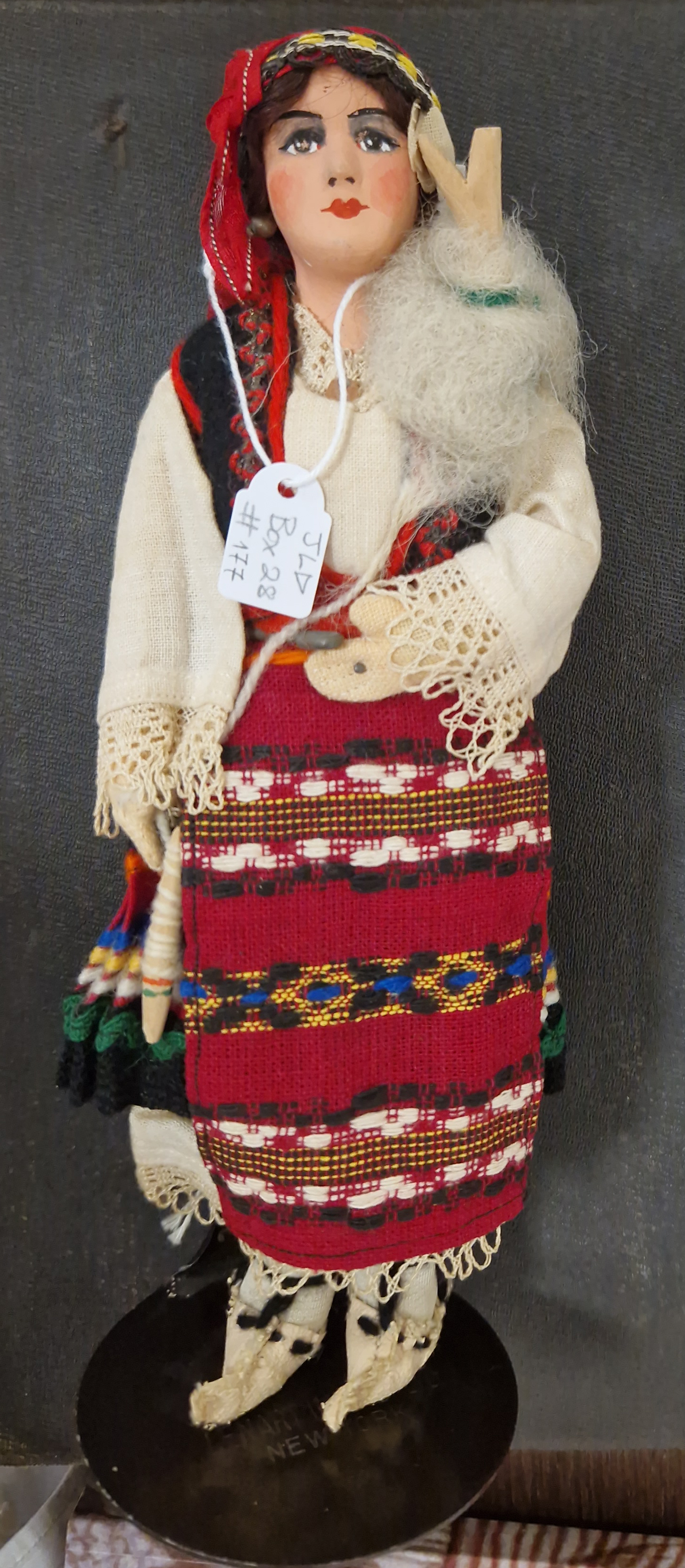 “The total Bulgarian stock on hand is less than fifty dolls, but in addition to those listed at $6.50 is a ‘Mummer’ with goat head mask, cow-bell and strange costume, while at $7.50 each is a New Year’s Caroler, a Tax Collector, a Shepherd and the great 12th century Bulgarian King Assen in regal robes and early Christian symbols. His story page is especially interesting.” (Doll Talk, vol. 3, no. 6).