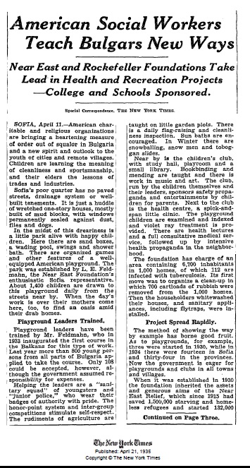 I only learned of Leonty E. Feldmahn recently and by accident. I didn’t remember him from any earlier reading. Feldmahn is not mentioned in the standard history of the Near East Foundation, or on the Foundation’s historical web site. He appears only three times in the New York Times: when he was awarded the Bulgarian Cross for Philanthropy from King Boris (he had in 1923 established “a playground and children’s club in Sofia serving 4200 poor children,” December 31, 1935, p. 17); earlier in 1935, when the character of the playground and club was described in detail (April 21, 1935, pp. 78, 80); and in his obituary (January 6, 1962, p. 16).