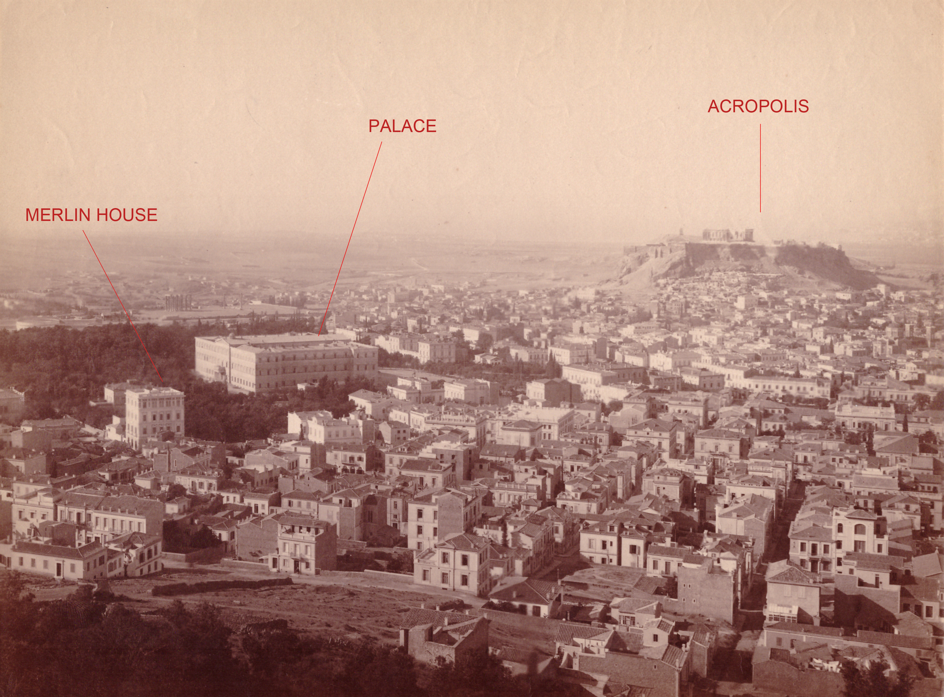 View of Athens from Lycabettus Hill showing the Merlin House and the Palace, ca. 1895.