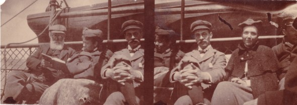 Two partially overlapping frames depicting from left to right: Basil L. Gildersleeve (the founding editor of the American Journal of Philology), Alice Walton, Wilhelm Wilberg, and Nellie Reed, 1896. ASCSA Archives, Nellie M. Reed Papers.
