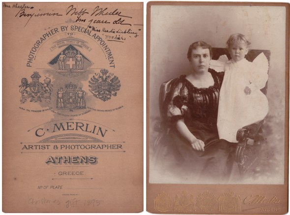 Little Benjamin Wheeler with his mother Amey Webb Wheeler, 1895. The photo was given to Nellie as a Christmas gift. The photographer, Charles Merlin, is the same Merlin who owned the Merlin House and two more houses on Kephissias Avenue (one of which is the French Embassy today).