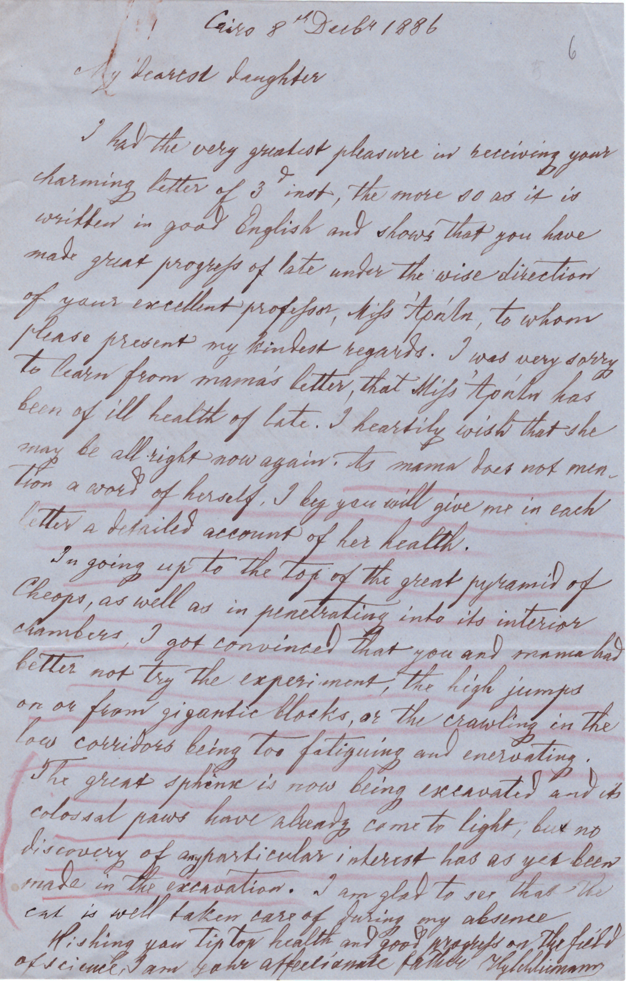 On December 8, 1886, writing from Cairo, Schliemann praised his daughter Andromache for her good English: ‘I had the very greatest pleasure in receiving your charming letter […], the more so as it is written in good English and shows that you have made great progress […]. In the same letter he informed her of the excavation of the Great Sphinx at Giza: The great sphinx is now being excavated, and its colored paws have already come to light […].’