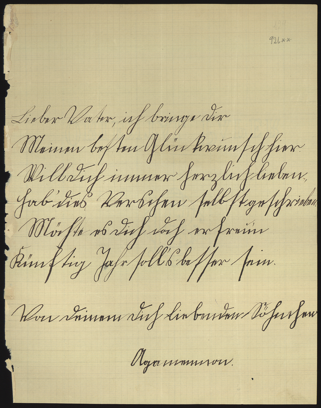 Agamemnon and Andromache, ca. 1883. Agamemnon’s German letter to his father, 1886 (ASCSA Archives, Heinrch Schliemann Papers, Box 97, #926d).