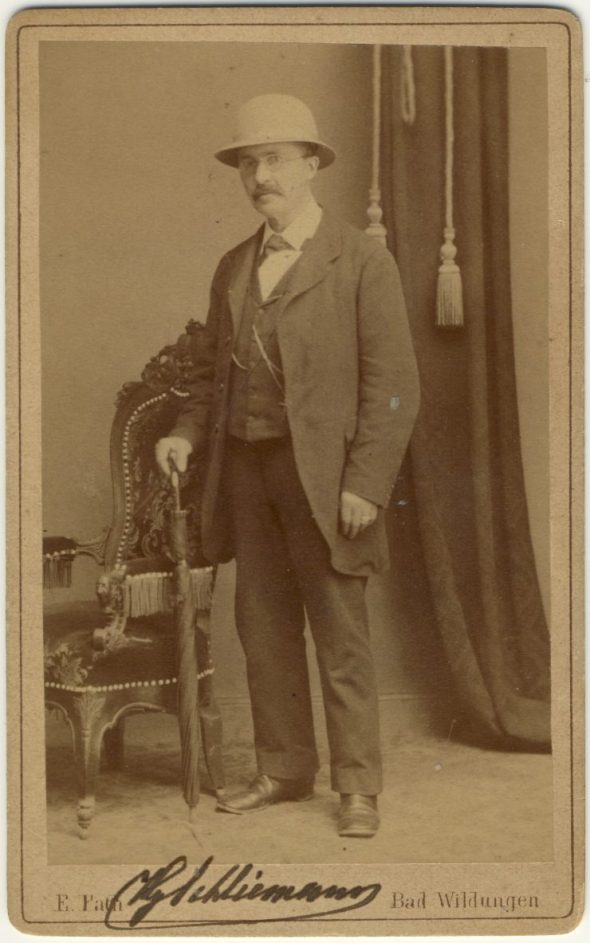 On August 22, 1883, Sophia wrote him from Franzenbad: ‘I have had enough of the baths…’ (‘Απηύδησα πλέον των λουτρών‘). Before that, she thanked him for the photograph he sent from Bad Wildungen, commenting humorously: ‘Your photograph […] is most expressive; I read my whole little Heinrich in it (‘αναγιγνώσκω μέσα εκεί όλον μου τον Ερρικάκη‘). Surely you thought of me at that very moment, for whenever you speak to me you wear that very expression.’ ASCSA Archives, Heinrich Schliemann Papers, Box 92, #703.