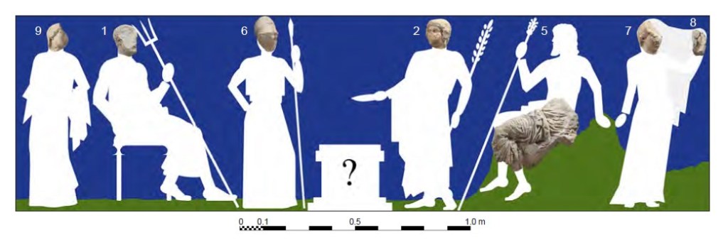 Stewart et al. refer to a fragmentary male head of high craftsmanship that was found in the Athenian Agora near the northeast corner of the Temple of Ares in 1933. Carved around 430-425 B.C. and identified as Hermes, the small head (H.: 0.147m) is one of forty-nine half-size marble fragments which once decorated the friezes of the Temple of Ares in the Agora (originally the Temple of Athena Pallenis at Pallene). A plan of the Agora with the findspots of the sculptures is included in the Hesperia article, and is also available at https://ascsa.net.