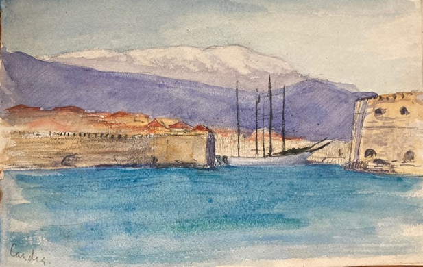 We visited an antiquarian bookfair in Concord, New Hampshire, about twelve years ago and a booth belonging to a dealer from Vermont, who specialized in original artwork, caught our eye. Sorting through piles of miscellaneous materials, we found a few things relating to Greece, and a small (8 by 4 inches; 20 x 10 cm) artist’s sketchbook grabbed our attention. It was displayed on a table opened to a watercolor view that seemed familiar. Surely it was the entrance to the harbor at Herakleion on Crete! And indeed, penciled in one corner was the inscription “Candia,” the older name for the city which both confirmed the identification and provided a clue that the sketchbook, as dealers in antiques like to say, “had some age.” There were other artworks in the sketchbook that are dated to April 1905, and still others with various dates in 1915, and one dated to 1916. The artwork from 1905 was the most interesting for us. Turning the pages of the sketchbook we saw line drawings of dancers at Knossos and a man drawing water from a well in Siteia, pastels of houses labeled Knossos and “Sitia, as well as watercolors and line drawings of Mykonos, Ios, and other Cycladic islands, Sounion, and Athens. The unknown artist was interested particularly in the new Minoan finds from Knossos as is evident from the line drawings of wall paintings and artifacts in the “Candia Museum.”